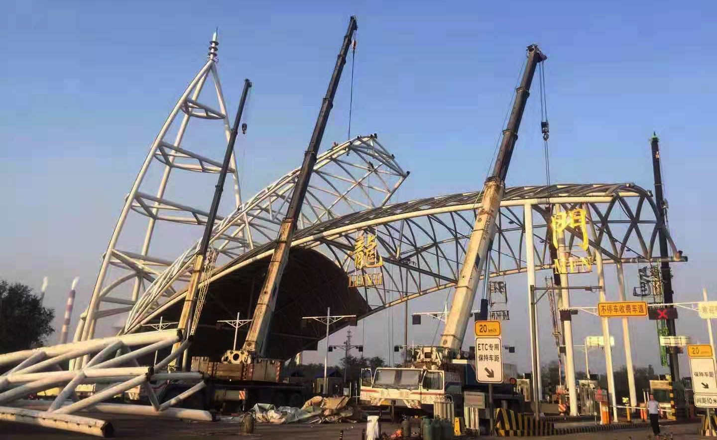 运城晚报讯 9月30日,河津龙门黄河大桥收费站成功拆除,运城北高速公路分公司取消省界收费站工作取得重大进展。 龙门黄河大桥收费站位于G5京昆高速侯禹段,日均车流量2万余辆,是连接晋陕两省的交通要道。该收费站顶棚为整体精钢焊接结构,最高点约53米,最大跨度119米,重达370余吨。