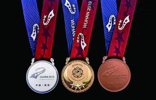 ▶10月10日,第七届世界军人运动会执委会在武汉举行新闻发布会,公布了本届军运会奖牌、奖杯等颁奖物资。军运会奖牌“和平友谊之星”、军运会奖杯“腾飞”等正式亮相。 这是10月10日拍摄的本届军运会银牌背面图案、金牌正面图案、铜牌背面图案(从左至右)。
