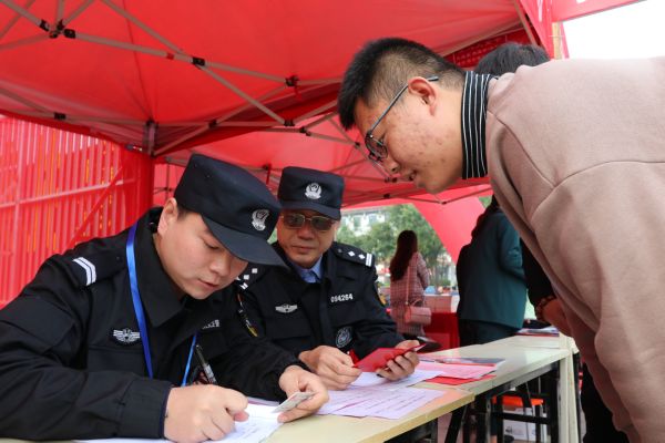 ▲近日,退役军人在闻喜县公安局招聘台前咨询、报名。