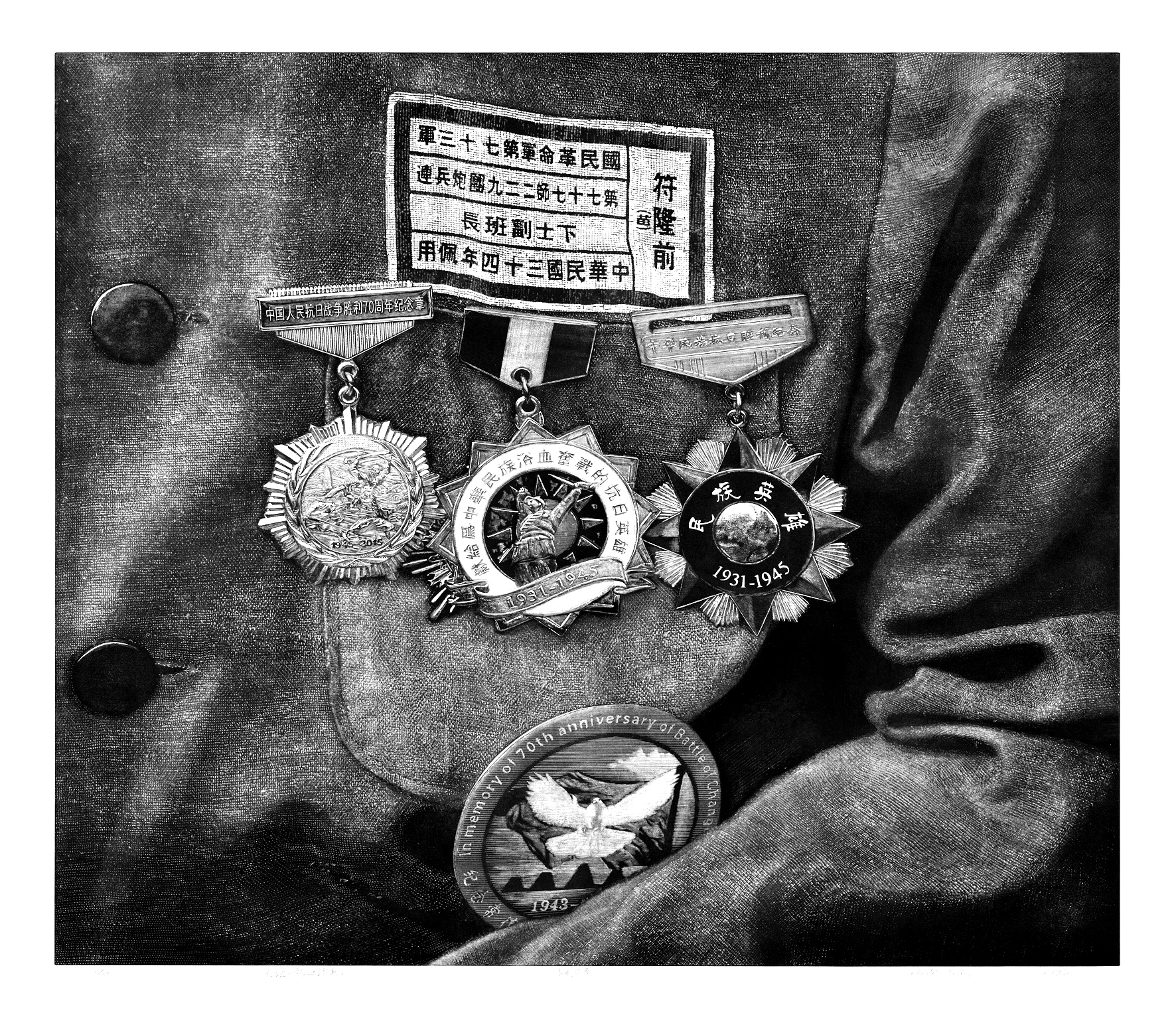 ★几枚安静悬挂胸前的军功章,遮掩不住衣襟后面热血胸膛中依旧澎湃着的豪迈英雄气概!作品由小见大,让我们读懂了“筑成我们血肉长城”的精神所在——所有牺牲的和幸存的无畏军人、所有爱国的广大民众,在统一战线旗帜下凝聚起来的抗击外来侵略者的不败精魂!