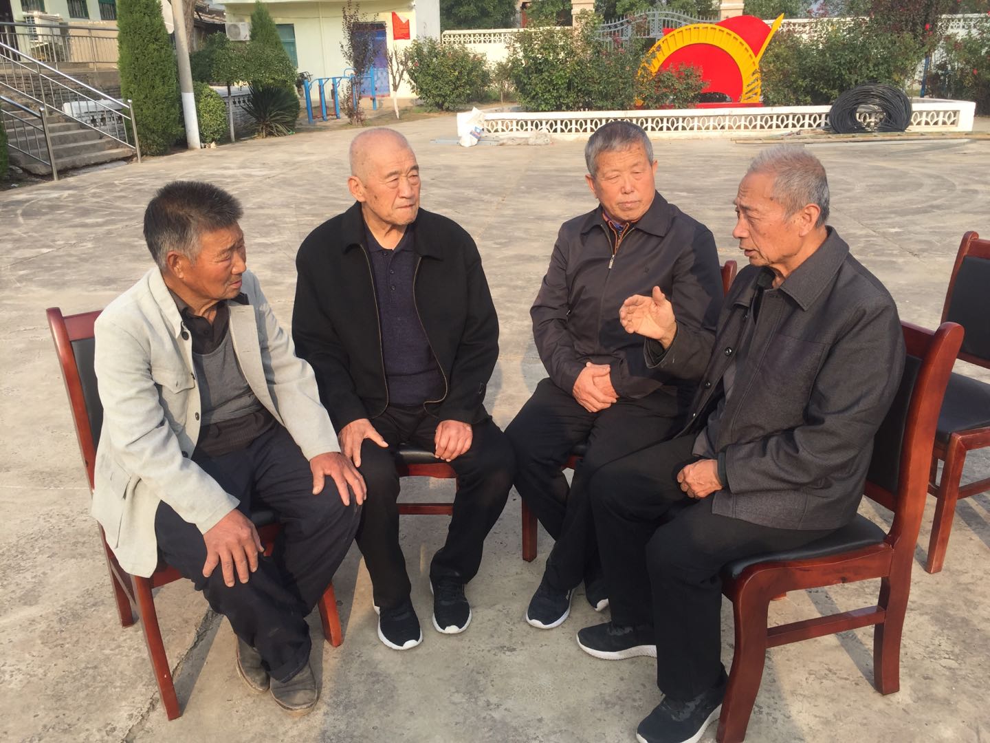 ▲张培民(右一)、张乱亮(右二)、张庶民(右三)、张海马(右四)四位老干部在一起商量筹建纪念馆