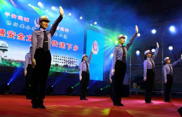 ▲《交通安全出行歌》节目中,民警表演交通指挥手势操。 樊朋展 摄