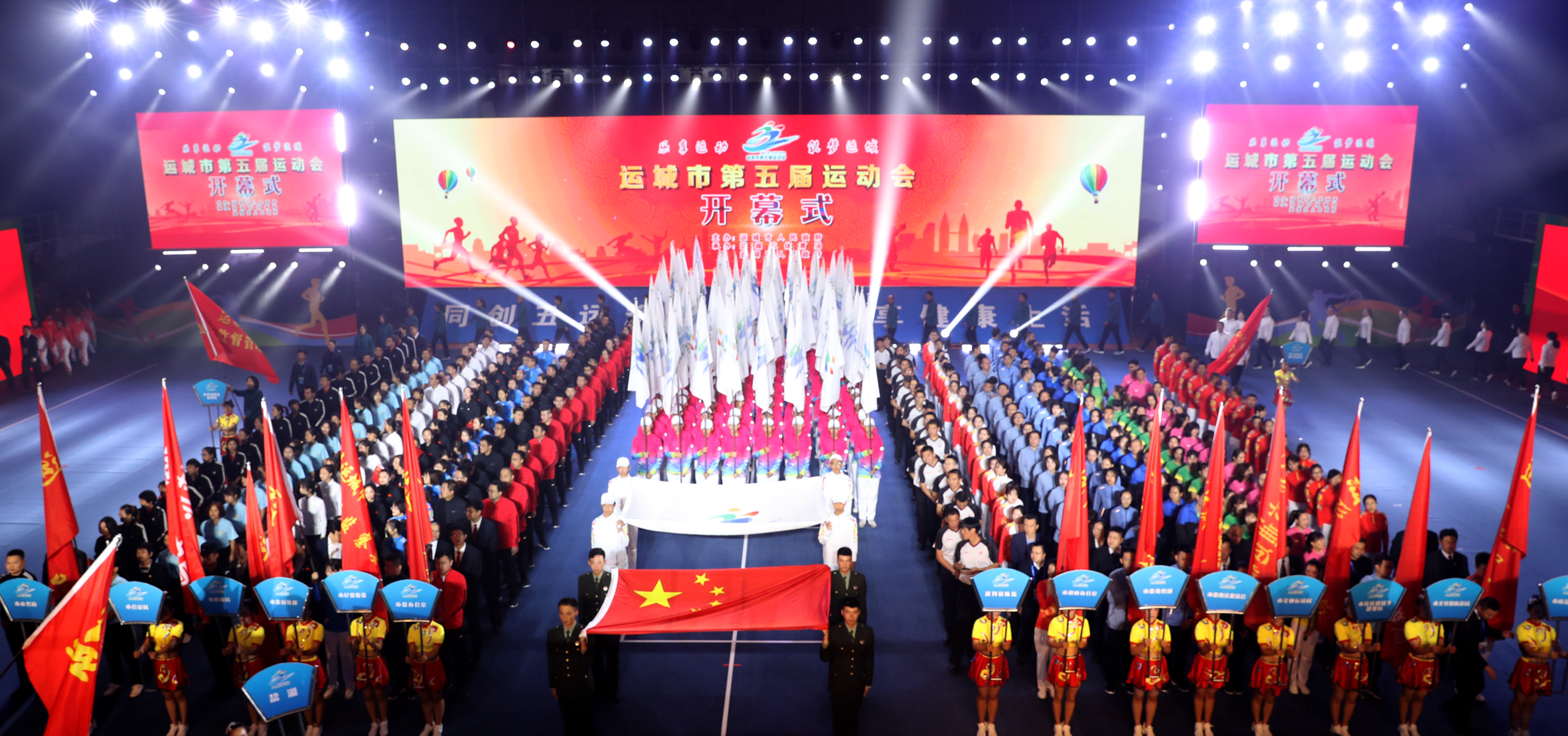 上午8时30分,4位刚刚参加新中国成立70周年大阅兵的国旗护卫队运城籍战士李国震、陆麒先、胡碧乔、王亚新手擎庄严的五星红旗,迈着铿锵有力的步伐进入会场。紧随其后的五运会会旗用彩带、浪潮、吉祥鸟和火炬等元素,彰显运城体育事业的蓬勃发展和更高、更快、更强的奥林匹克精神。各代表队迈着整齐的步伐,以自信昂扬的姿态一一入场。