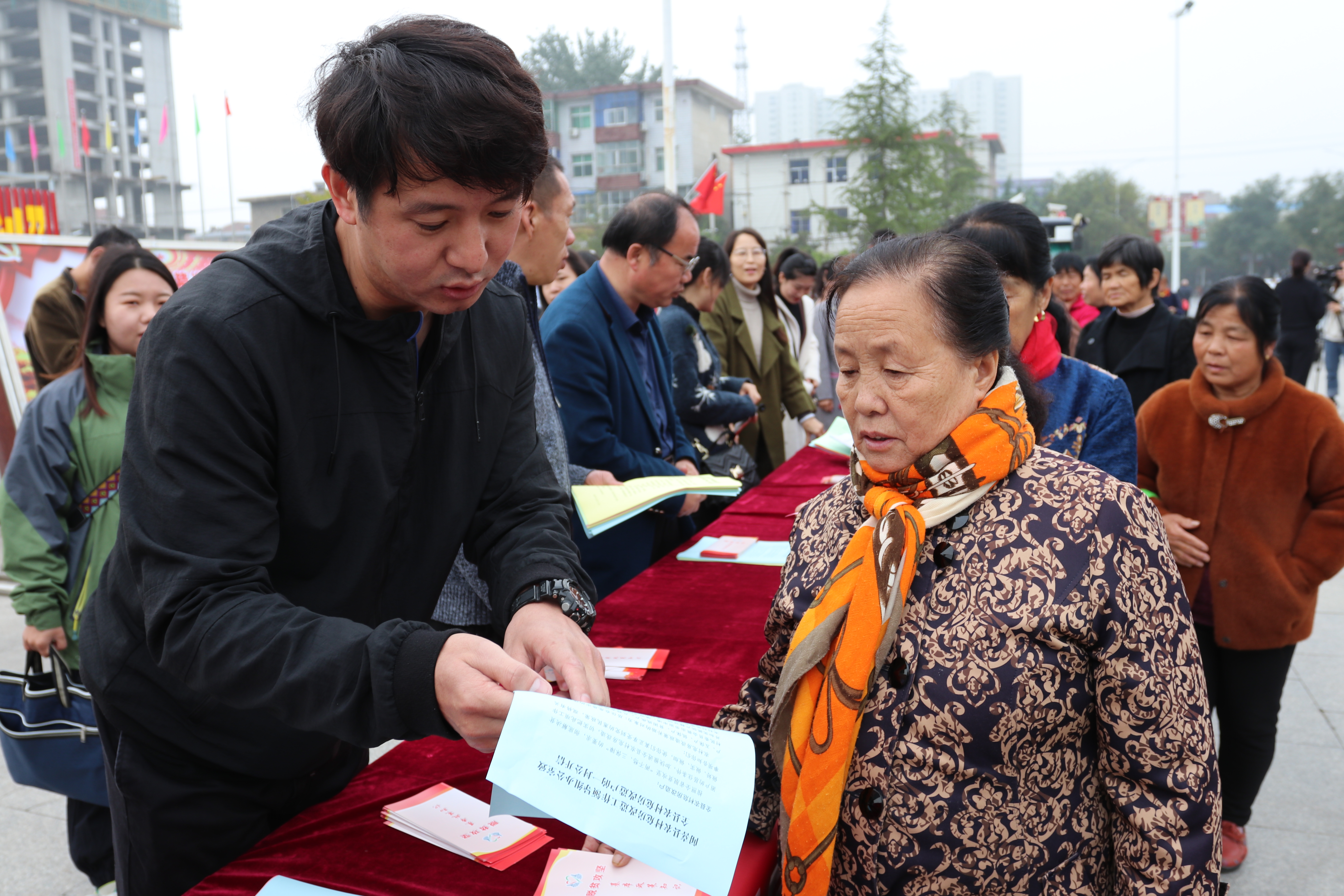 ▲10月17日,闻喜县住建局工作人员在向过往群众宣传国家有关扶贫政策。 当日,是第六个“国家扶贫日”。该局通过悬挂宣传横幅、发放宣传资料和设立咨询服务台,开展“真情扶贫 助梦前行”主题活动,向广大群众讲述扶贫攻坚的重大意义和有关政策;并从关爱贫困人口生活等方面入手,深入到帮扶村登门入户进行帮扶。 特约摄影 刘佳