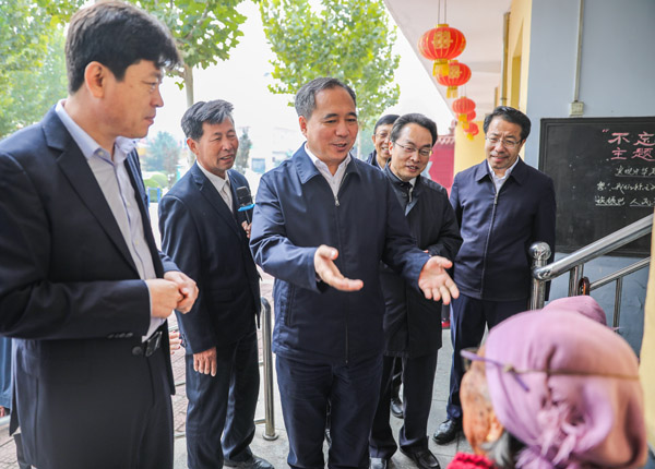 王成在盐湖区雷家坡村日间照料中心和老人们交谈。金玉敏 摄