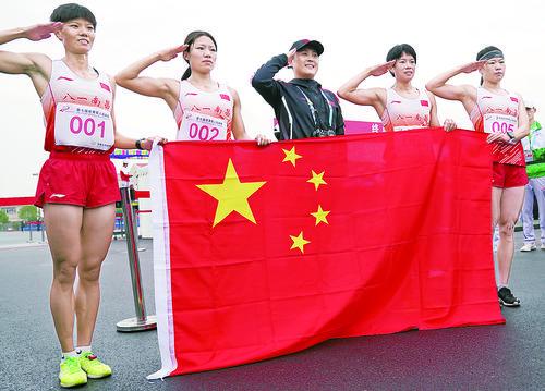 ▲10月23日,中国队成员在女子个人全能越野跑比赛后手持国旗敬礼。 当日,第七届世界军人运动会女子个人全能项目比赛在武汉陆军工程大学军械士官学校结束,中国选手卢嫔嫔以5627.2分的总成绩获得冠军,队友管超楠以5567.6分的总成绩获得亚军,王堂林以5506.3分的总成绩获得季军,孙洪燕以5474.1的总成绩获得第四名。 新华社记者 王建威 摄