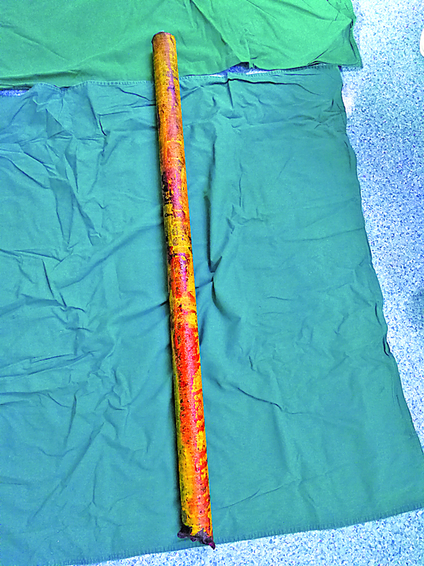 对于这样严重的外伤者抢救,时间就是生命。虽然孙师傅当时神志尚清醒,但随时可能因出血过多导致休克。更棘手的是,如果先将钢管截断再进行取出,钢管可能会出现变形,并且切割的同时,极易造成震动,会给患者带来二次创伤。术中发现,钢管强大的冲击,已经将孙师傅的两根肋骨“冲”出了体外。