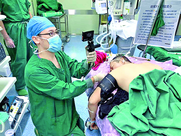 情况紧急,容不得多想,王俊星决定采用纤支镜引导下的气管插管术进行麻醉。纤支镜,全称纤维支气管镜,是利用现代高科技,将数万根极细的玻璃纤维组成一根直径仅数毫米的可弯曲的内窥镜,由患者的口鼻插入,来诊断支气管疾病的一种仪器。