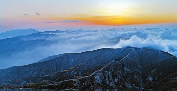 ▲10月26日,日出之时,朔州广武明长城望雁楼前出现罕见的云海,在金色阳光的照耀下,波澜壮阔。云海沿广武明长城最高处的望雁楼向两侧的长城涌动,甚是壮观。 王晋飞 摄影报道