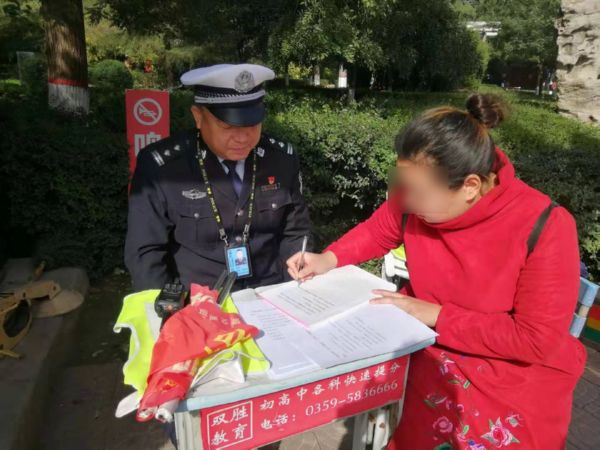 ▲一女子因驾驶电动车逆行抄写法规条文 樊朋展 摄