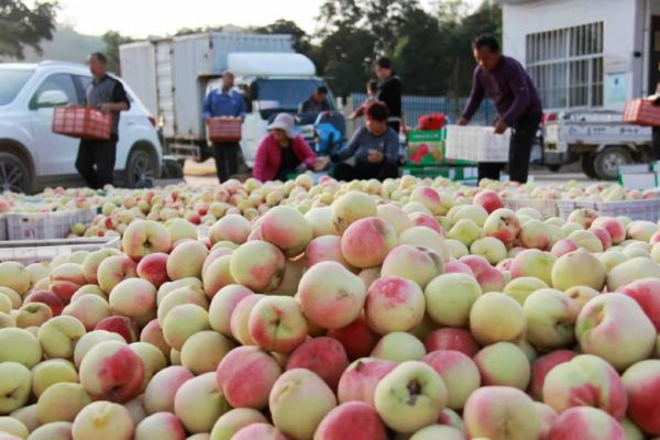 10月27日,盐湖区上郭乡郭家岔村民在挑选鲜桃装箱销往外地。