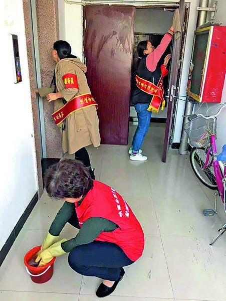 志愿者在擦拭楼宇门 刘凯华 摄