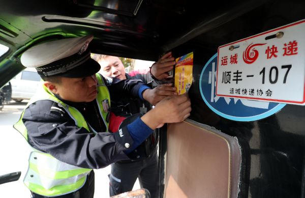 民警为快递车粘贴交通安全即时贴 特约摄影 葛崇收