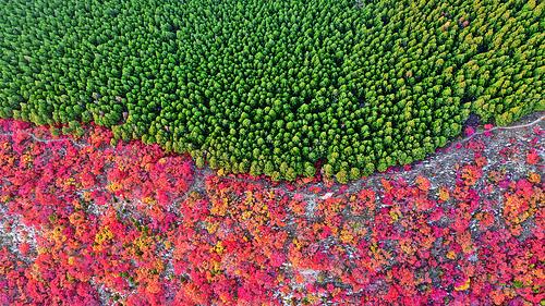 ▲火红的黄栌树林与绿色的松林沿济南蝎子山山脊分布(11月4日无人机拍摄)。 日前,位于山东济南市的蝎子山以山脊为分界线,形成了“一山双色”景观,令人称奇。据了解,蝎子山山体南侧种植着2万多平方米的黄栌树,而在山体的北侧是松树林,所以每到秋冬交替时节,便出现了半边青翠半边红的景象。 新华社发