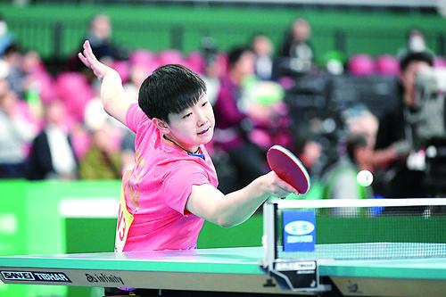 ▲11月6日,中国队选手孙颖莎在比赛中回球。最终,她以3比0战胜埃及队选手梅谢里夫。 当日,在2019国际乒联团体世界杯女子小组赛中,中国队以3比0战胜埃及队。新华社记者 华义 摄