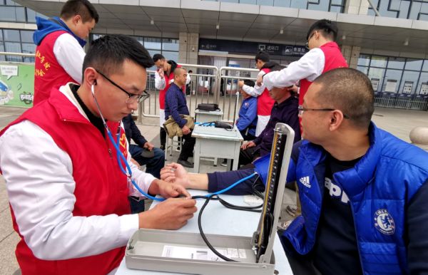 ▲11月6日,志愿者在给旅客免费量血压。记者 薛俊 摄