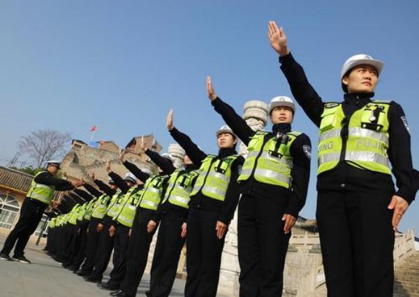 11月5日,在新绛县龙兴文体广场,该县公安局交通警察大队交警、辅警在苦练指挥手势硬功夫。特约摄影 高新生