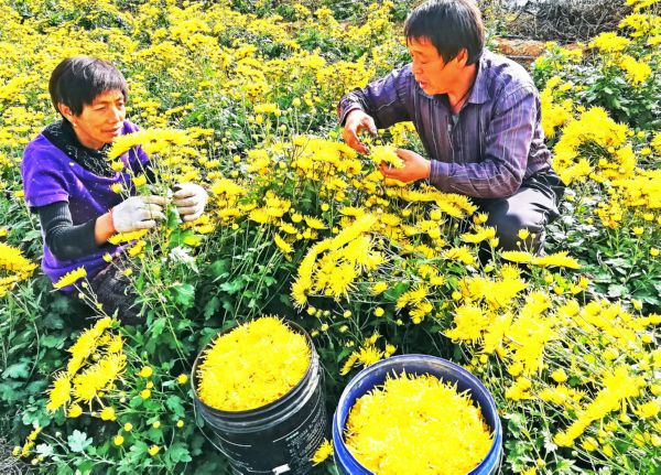 ▲近日,村民在田间采摘菊花。 特约摄影 鲁国林