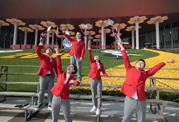 11月10日,第二届进博会志愿者在上海国家会展中心场馆入口处留影。