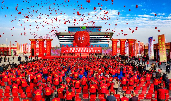 11月11日,临猗果业发展60年暨第八届山西临猗果品文化节在该县新城中心广场开幕。本届果品文化节将持续至11月15日,设立1个主会场、1个分会场,覆盖4个街区。图为开幕式现场。 记者 薛俊 摄