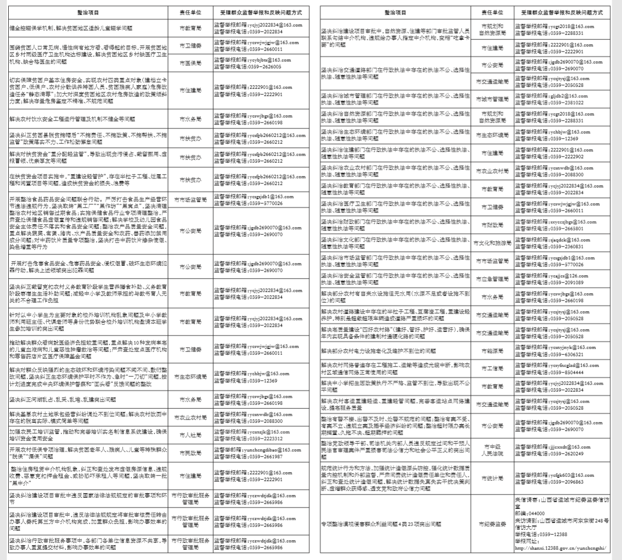 按照党中央、省委、省纪委监委、市委在“不忘初心、牢记使命”主题教育中开展专项整治的要求,近日,运城市纪委监委机关牵头、会同23个市直单位制定了《关于专项整治漠视侵害群众利益问题的工作方案》,开展对4个方面23项突出问题的专项整治。此次专项整治聚焦扶贫领域腐败和作风问题,聚焦教育医疗、环境保护、食品药品安全等民生领域侵害群众利益问题,聚焦发生在群众身边的不正之风和“微腐败”问题,聚焦统计造假问题,着力解决群众最关心最直接最现实的利益问题,不断增强人民群众的获得感、幸福感、安全感。为方便群众参与监督和反映问题,现将专项整治受理群众监督举报和反映问题方式公布如下。
