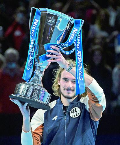 ▲11月17日,西西帕斯高举冠军奖杯。 当日,在2019ATP世界巡回赛年终总决赛单打决赛中,希腊选手西西帕斯以2比1战胜奥地利选手蒂姆,夺得冠军。 新华社记者 韩岩 摄