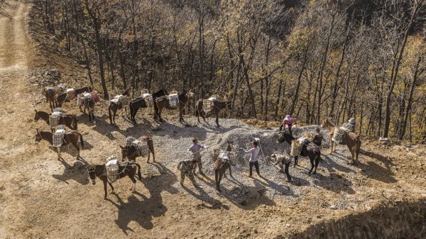 11月19日,在垣曲县皋落乡民兴村,由赵泽全带队的四川凉山州德昌县茨达镇马帮,穿梭在山林中,为大山上建设风电工程托运石料与电塔配件等。 特约摄影 吕向前 摄