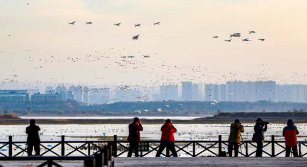 11月19日,摄影爱好者在平陆县三湾黄河湿地大天鹅景区创作。 记者 高志勇 金玉敏 摄