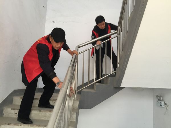 志愿者在擦拭楼梯扶手 刘凯华 摄