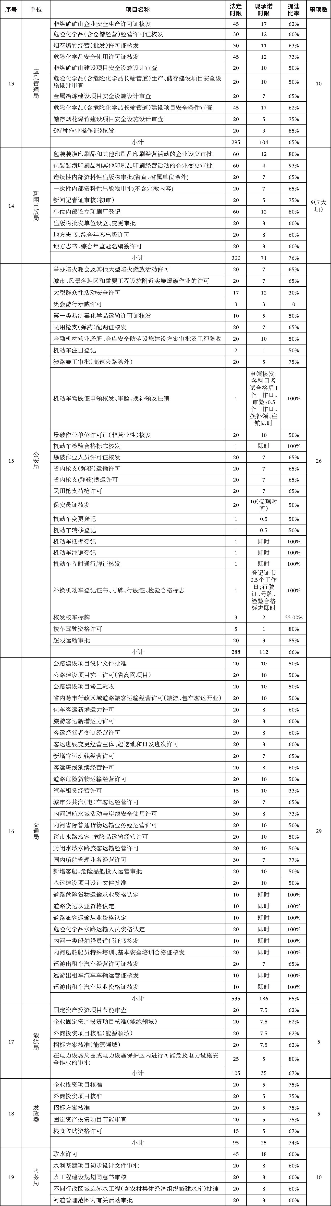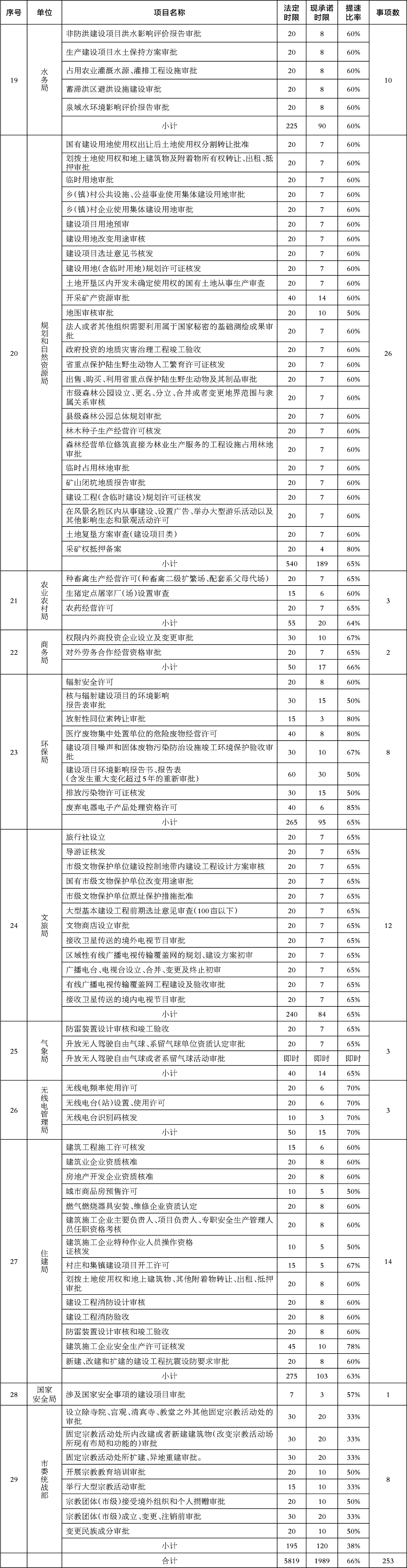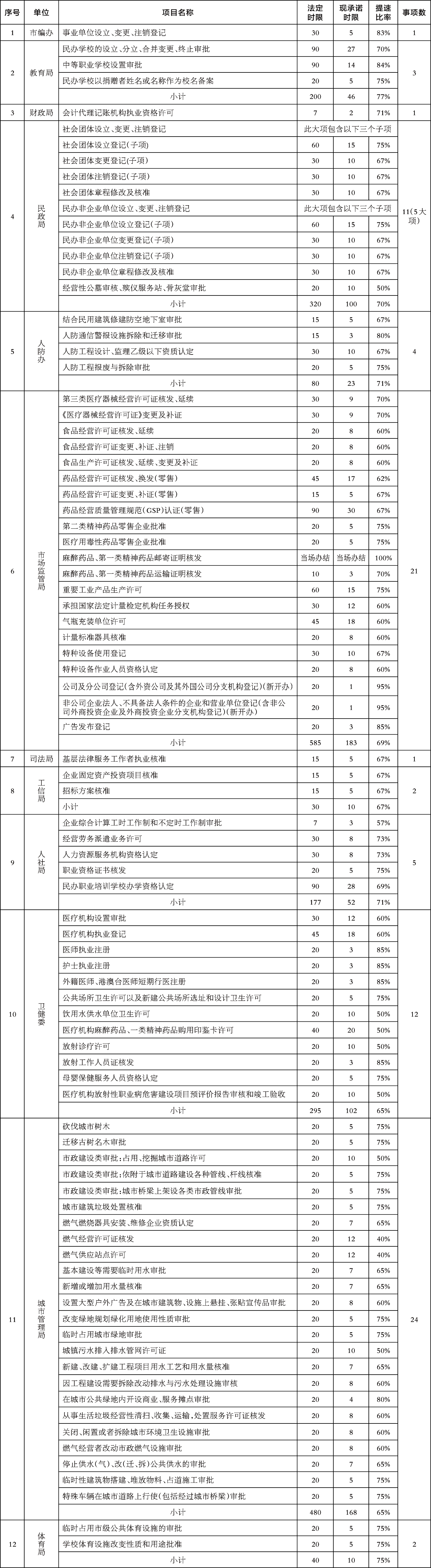 在“不忘初心、牢记使命”主题教育中,市行政审批服务管理局认真贯彻落实市委主题教育领导小组关于开展“三服务”聚焦解决群众办证难突出问题和纠治行政审批服务中“吃拿卡要”、办事效率低等问题专项整治总体工作部署,组织开展“优流程、减环节、压时限”专项行动,通过以为企业和群众办好一件事,打造链条式审批模式,对审批流程进行再造;通过下放审批权限、减少审批程序、合并审批事项等措施,对审批环节进行精简;通过优化审批服务、实行告知承诺等方式,压缩审批时限,取得了明显的阶段性成果。目前市本级29家单位253项行政许可事项法定时限为5819个工作日,现承诺时限压缩到1989个工作日,审批时限平均压缩到66%。超额完成市委市政府要求审批时限压减一半的目标,有效提升了企业和群众的获得感和满意度。现将各审批主体压缩时限情况公示如下,并接受社会各界监督。监督电话:0359-2665986