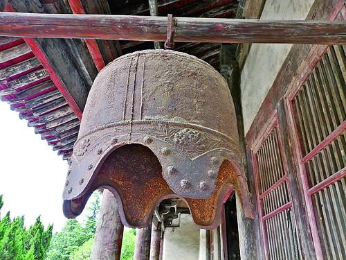 余庆禅院是北宋元丰元年(1078)敕建的香火寺,亦称“余庆寺”。余庆禅院元代铁钟,位于余庆禅院正殿廊下,通高64厘米,其中钟钮高12厘米,底径58厘米,铸工精美。铁钟为覆桶形六耳波状口式,钟钮为蒲牢形,呈倒U形匍伏于钟顶,制法为浅浮雕,较为细致。较平缓的覆钵圆顶,呈三角位置分布有3个天孔,天孔之间装饰有卷草纹。钟肩一周装饰双莲瓣纹,虽然起伏不大,但平和而圆润。钟体制式简单,仅以范缝将之分为三个平均的方形铭文区。其上边及两侧饰条纹以间隔,下部则饰绳索状弦纹一周。钟裙与钟耳上方对称部位饰花卉一朵,耳缺对称部位饰连枝叶纹,沿钟耳外侧依耳之波状起伏凹凸饰花朵乳钉纹一周。整个钟的造型为短粗桶状,装饰虽然简单,但协调匀称,钟体粗短,反而显得稳定。