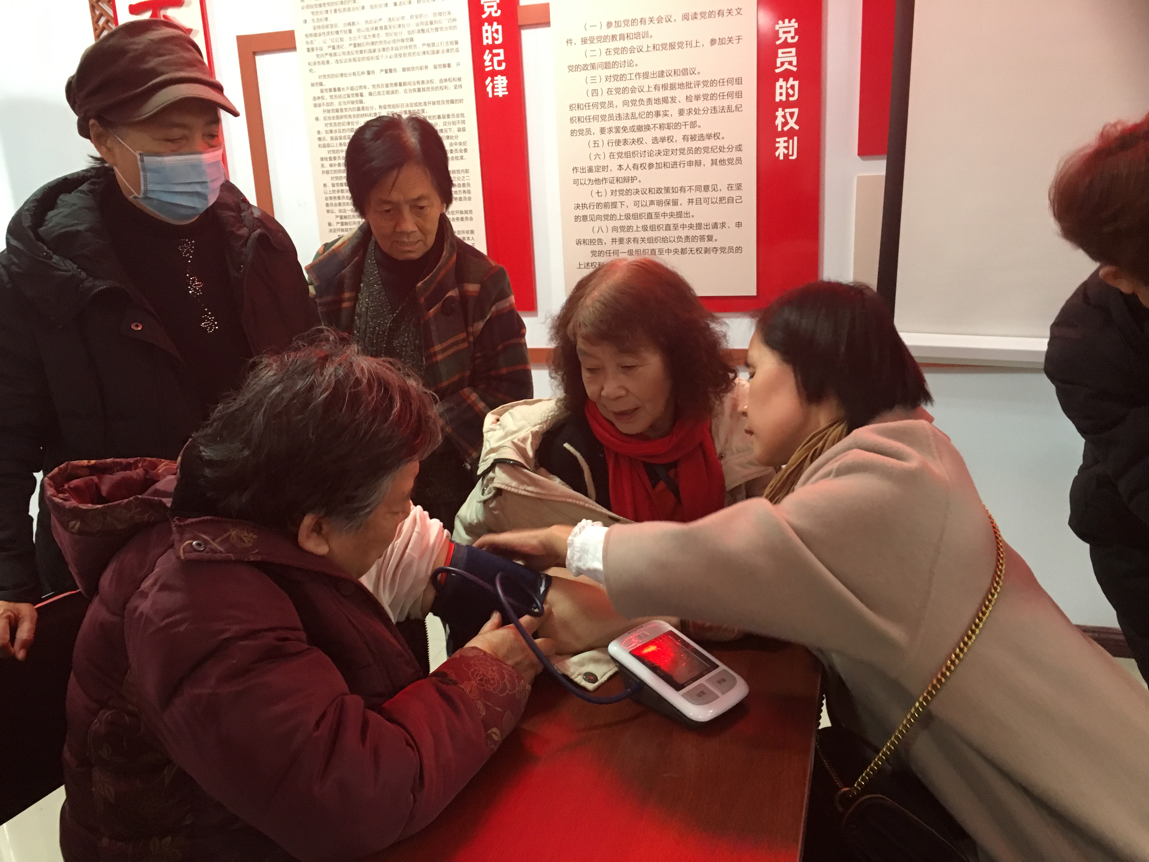 讲座结束后,临床营养师还给居民测血压,解答居民关于健康养生方面的一些疑惑。