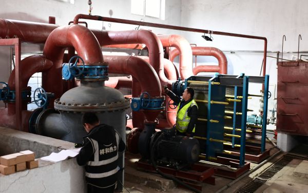 11月28日,闻喜县祥和热力公司技术人员在龙海苑小区换热站查看设备运行情况。 王琪琳 摄