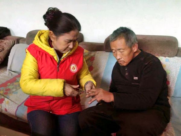 ▲志愿者为老人剪指甲 陶登肖 摄