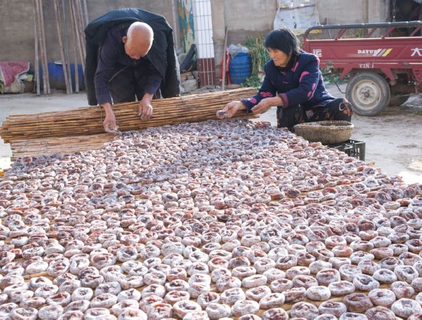 今年75岁的杜世忠与老伴辛勤劳作,靠两双手将自家5亩柿子树所产的柿子采摘并加工成1700多公斤大柿饼。近日,在他们还忙着晒柿饼时,已有几家客户前来订货。等捂晒两次成全白霜后,柿饼便可出售,可为家庭增收5万多元。