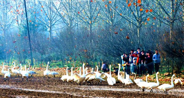 12月8日,位于平陆县三湾的大天鹅景区,游客观光拍照、投食互动,一幅人与自然和谐共处的生动画面。