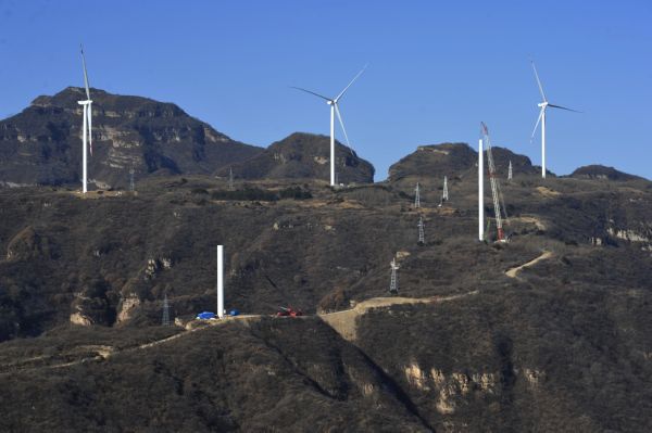 12月10日,芮城县金广丰风力发电工程项目,在大王乡柏梯山景区紧锣密鼓地进行着,一根根风杆迎风矗立在中条山巅。