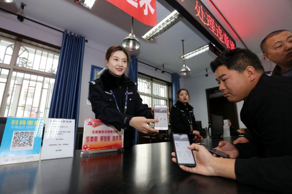 ▲12月12日,河津市公安局交警大队民警为处理违章的驾驶人讲解交通违法学习考试抵扣交通违法扣分的便民服务业务。