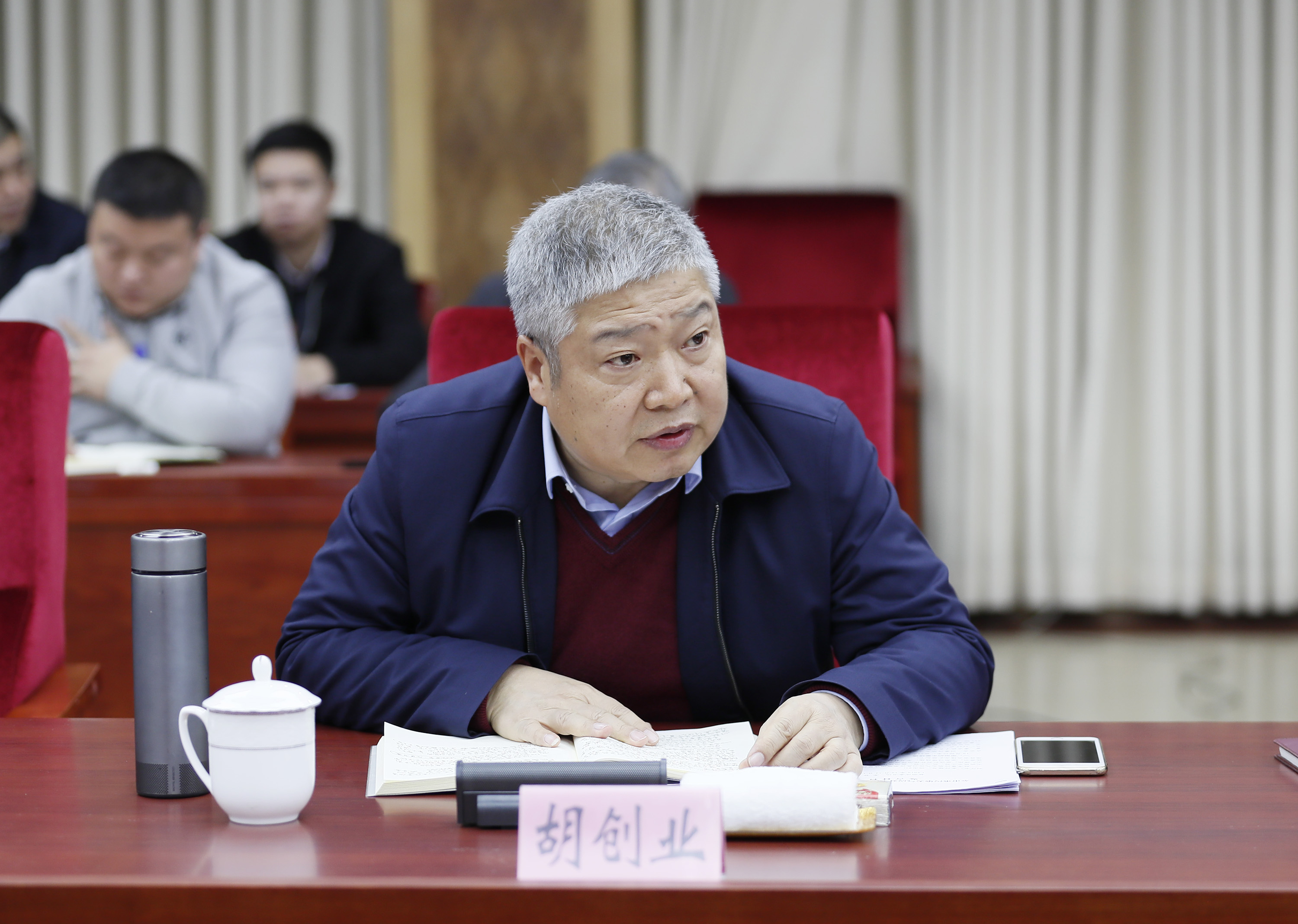 省生态环境厅监察专员、专项督察组常务副组长胡创业主持会议。 记者 闫鑫 摄