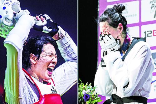 ▲左图为12月7日,中国选手郑姝音在世界跆拳道大奖赛总决赛女子67公斤以上级决赛后庆祝夺冠。新华社 叶夫根尼·西尼岑 摄