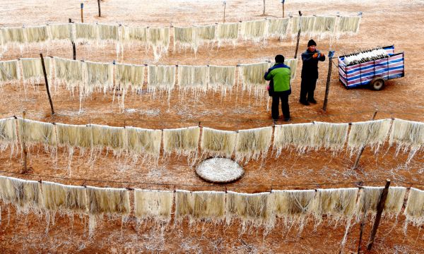 12月17日,垣曲县墨山底村爱元种植合作社社员在晾晒红薯粉条。特约摄影 崔松良 摄