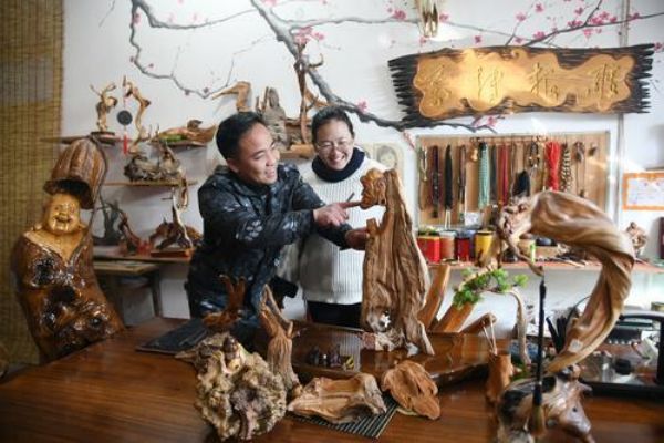 图为王万博与妻子一起探讨根雕艺术。 特约摄影 温徐旺 摄