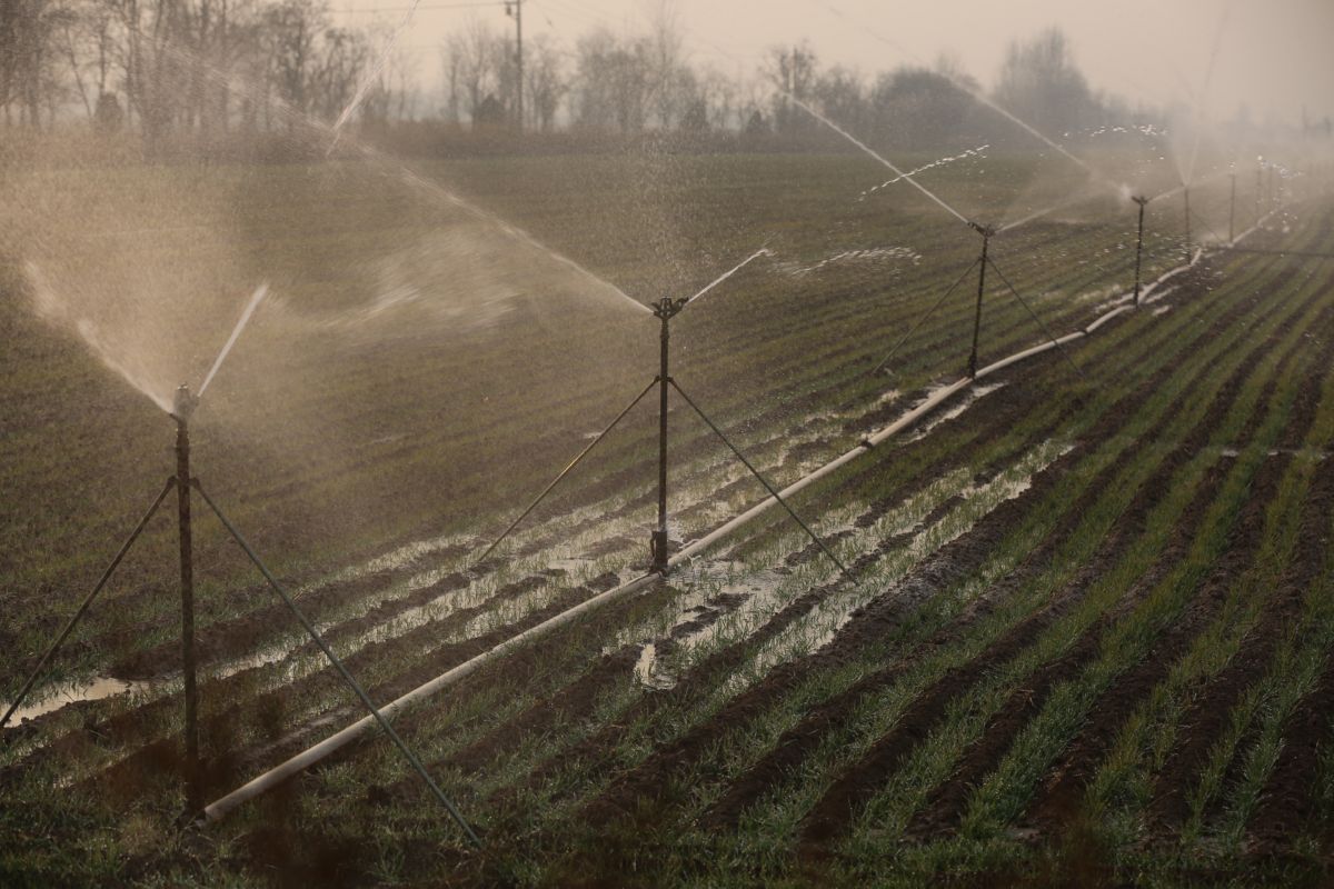 ▲12月20日下午,永济市伍姓湖农场东边的50万亩麦田里,农民在利用机械喷灌系统为麦田普浇越冬水。