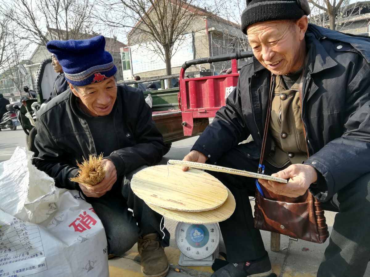 12月21日,垣曲县墨山底村农民龚德胜在市场销售箅箅和刷子,并与顾客一起交流自己的加工经验。