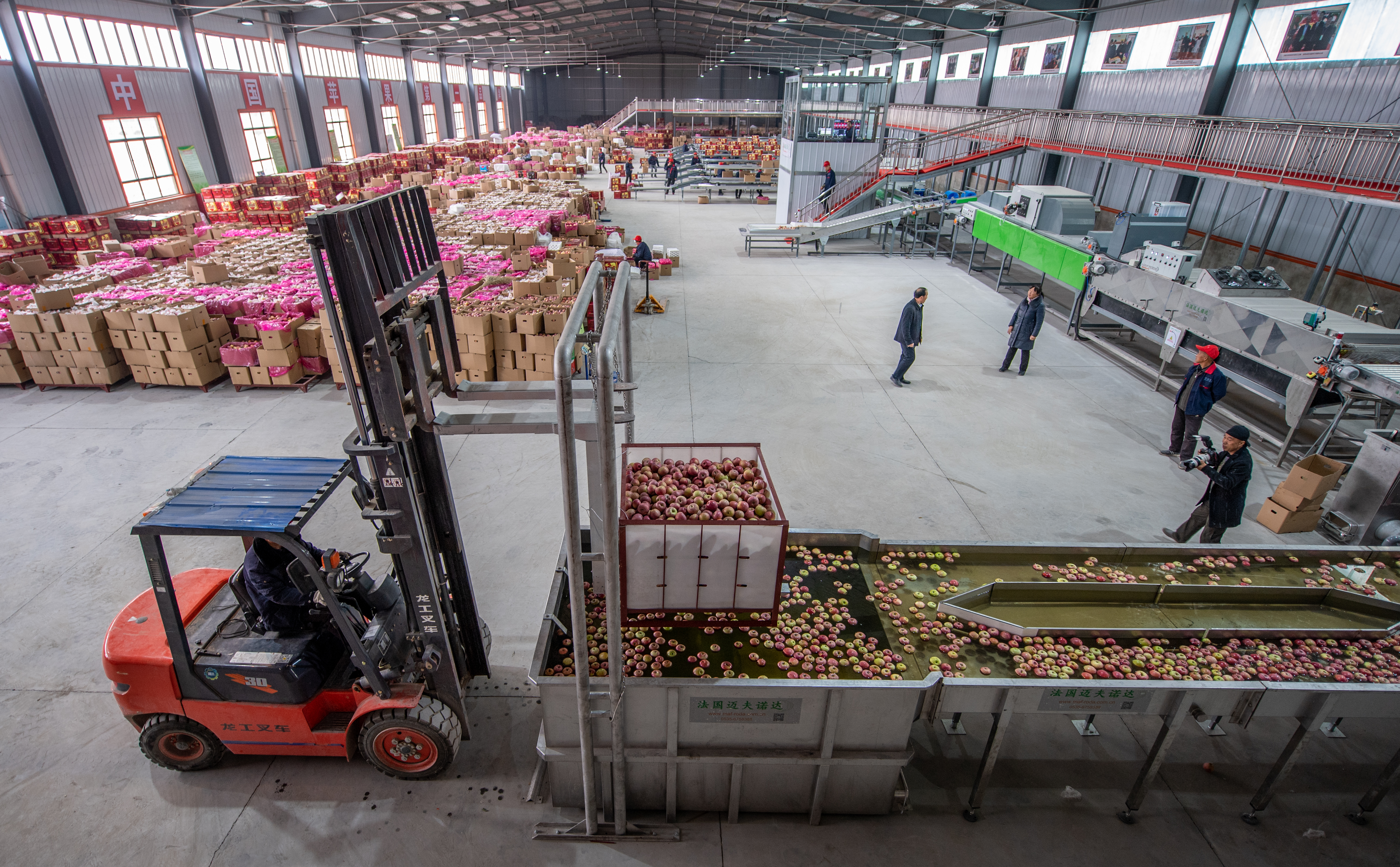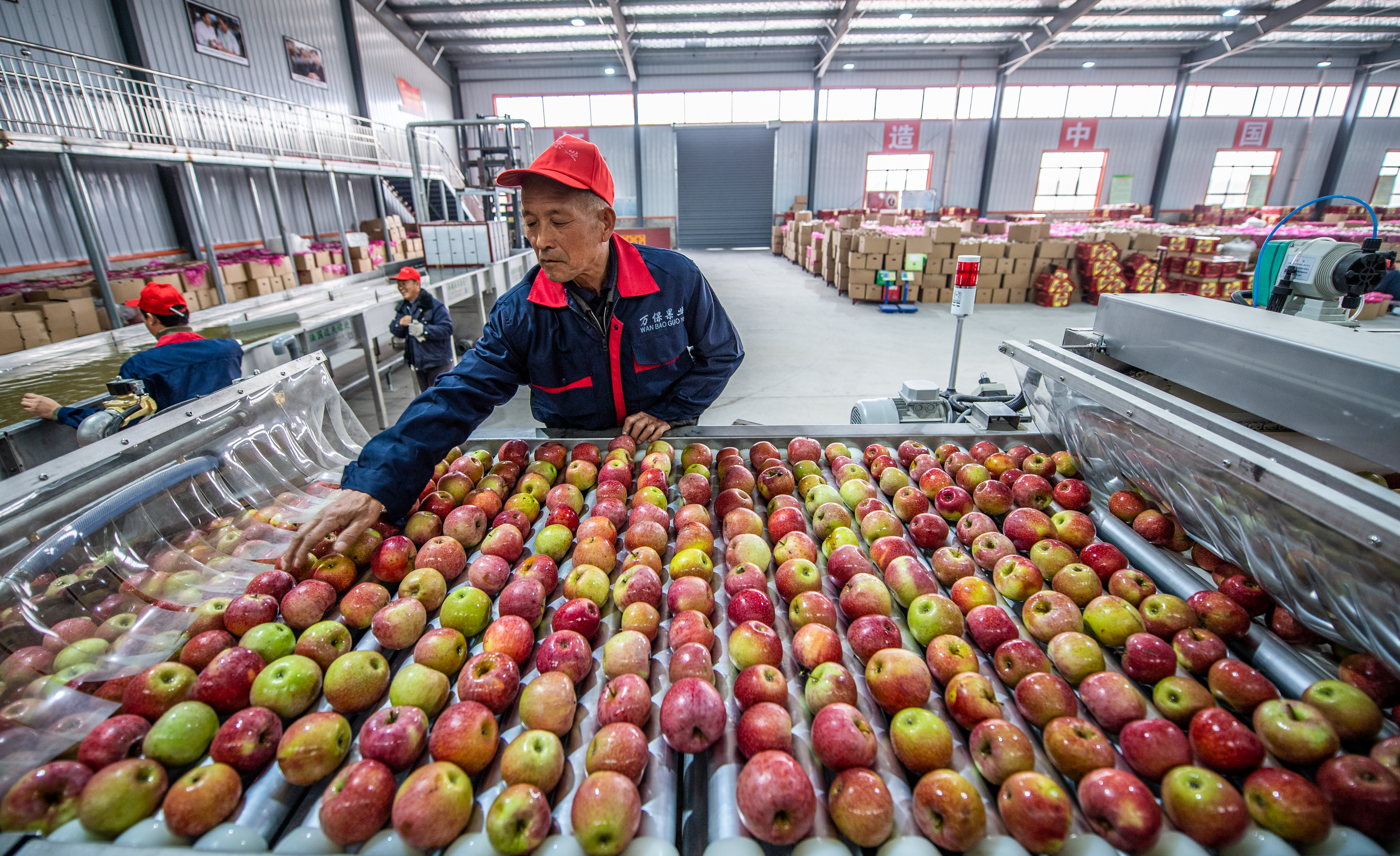 在“王万保”果品种植专业合作社苹果分拣车间,一场别开生面的“苹果分果管理机械化演示秀”正在上演。在专业人员的操作下,成百上千个大大小小的苹果,在机械化的“指挥”下,沿着各自的通道依次归位,每个环节井然有序。