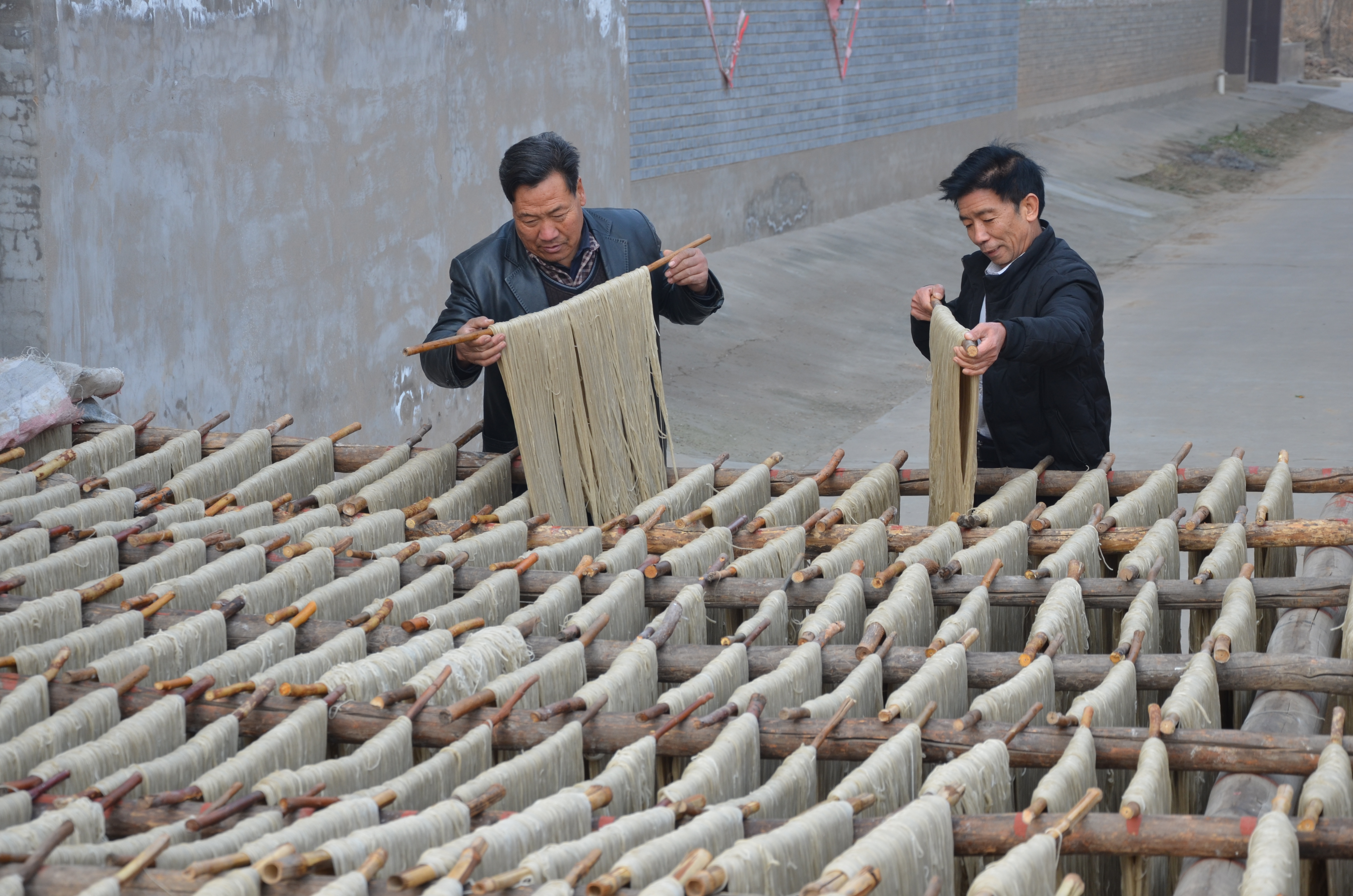 ▲12月21日,万荣县裴庄乡岔门口村的孙四亮(右)在晾晒粉条。