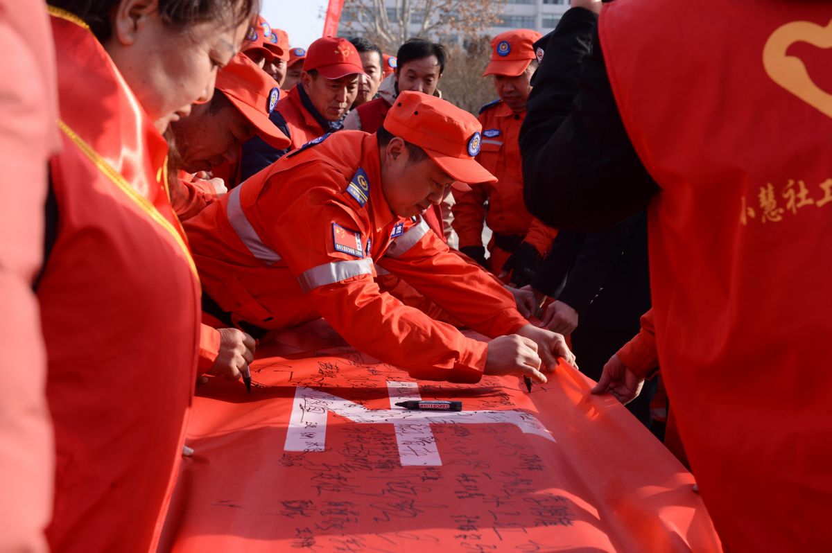 图为运城市青年志愿者救援队队员在百米横幅标语上签名。 记者 张君蓉 摄