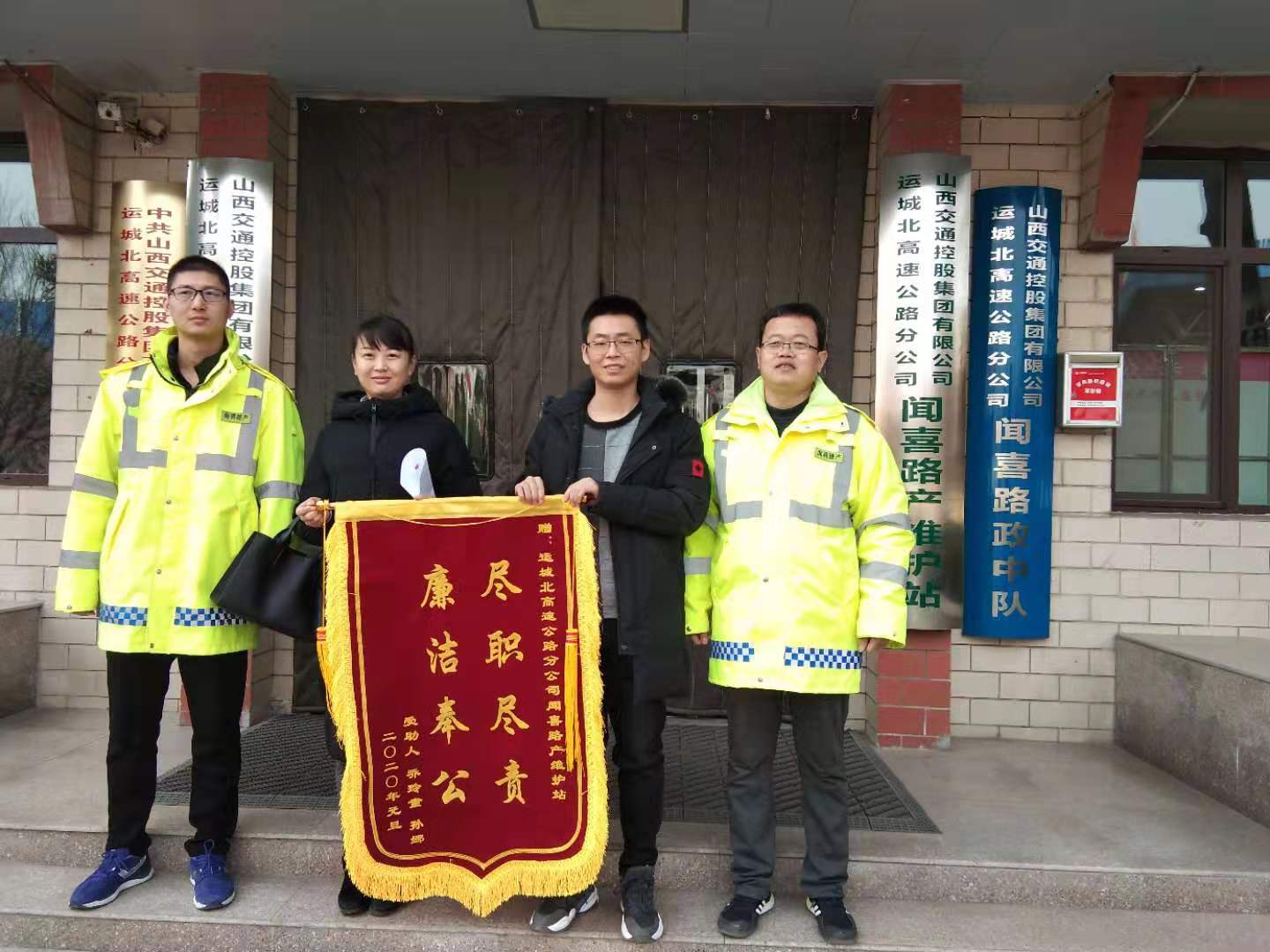 运城晚报讯(记者 范楚乔)1月3日上午,市民孙女士、乔先生将一面题有“尽职尽责 廉洁奉公”字样的锦旗,送到运城北高速公路分公司闻喜路产维护站,表达对该站工作人员尽心服务群众、维护高速公路安全通行的感激之情。