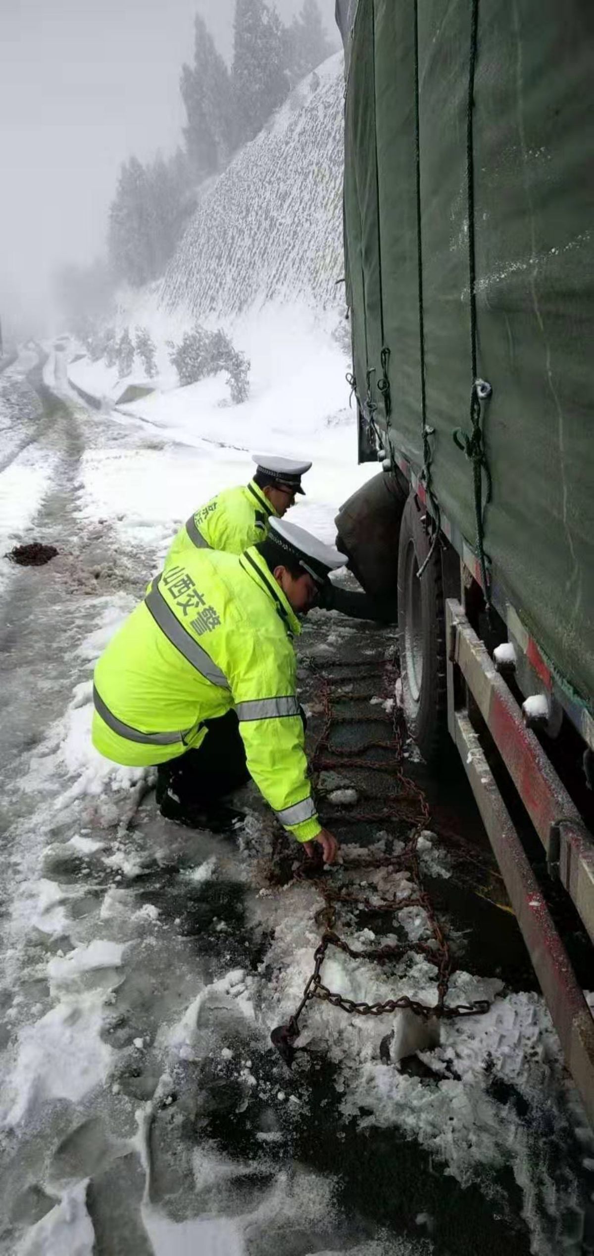 ▲芮城交警在辖区十二岭山区路段为被困车辆安装防滑链