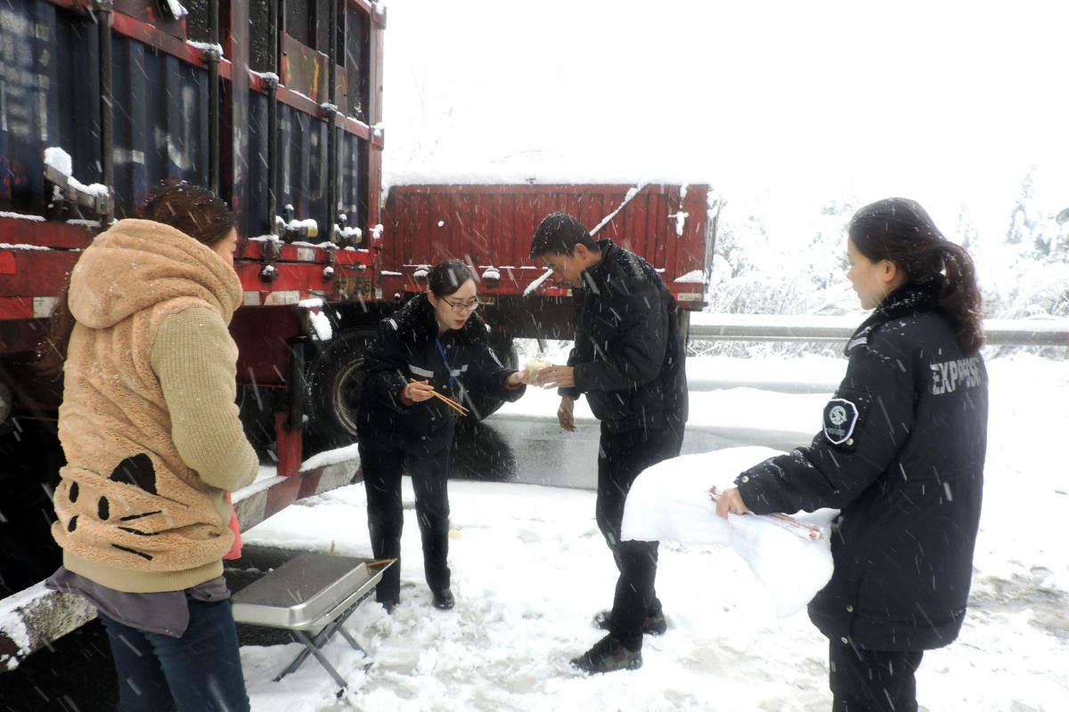 ▲垣曲西收费站工作人员为滞留司乘人员送上热馒头